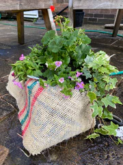 My annual ritual includes the use of coffee sacks as the hanging and hay basket liners as they make the perfect base, retain moisture and also look fantastic each providing a unique look!